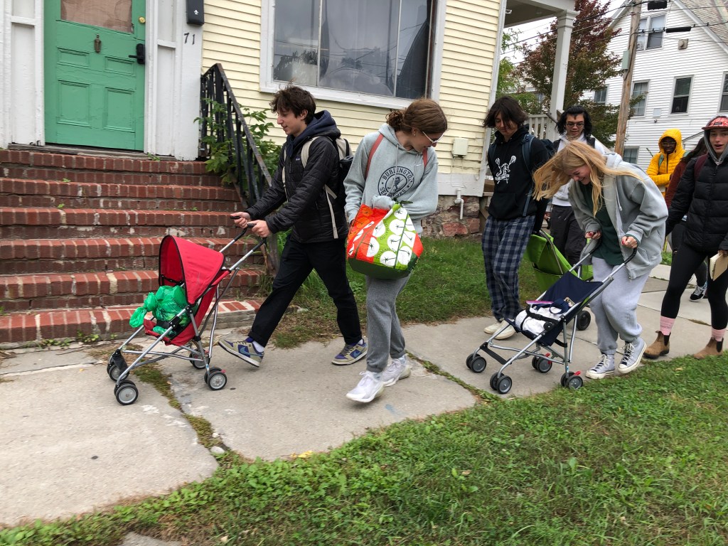 When we got off the #8 City Loop on September 23rd, it was surprisingly cold. It was also awkward. Some Burlington City & Lake Semester students laughed uncomfortably as they attempted to haul strollers and shopping bags off of the bus. Others groaned. All kinds of colorful language filled the air. One student’s crutches got caught in the door. We soon realized that everyone–those with gear and those without–had to step out of the bus onto a granite curb, before stepping (or rolling) through a rain garden. The “Mobility Equity Challenge” had done its job. It was an object lesson, quite literally, about who the public transportation system serves well, and who it isn’t designed for.