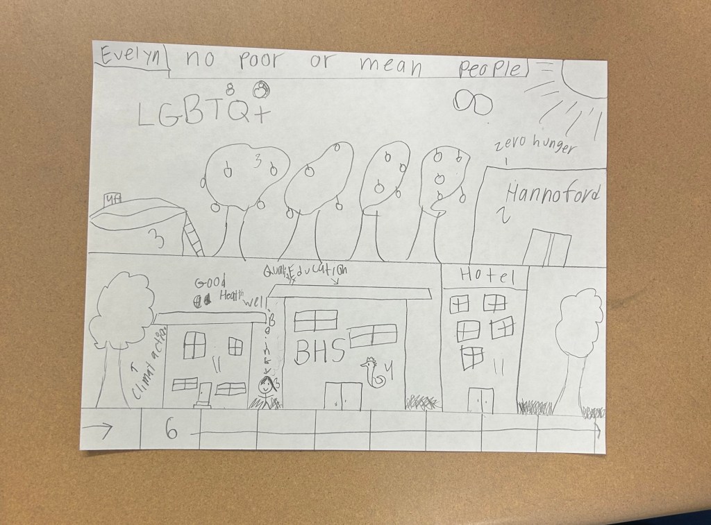 The classrooms buzzed with excitement as high school students asked their younger counterparts: What does your ideal city look like? The younger students drew vast cities with solar panels, parks, apartments, beaches, neighborhoods, and everything they saw fit to make a thriving city. High school students then challenged the class to show how and where the Sustainable Development Goals fit into their drawings. BCL’s guiding question—”What does it take for a community to thrive?”—drove discussions students had. Looking at a wider more global lens, while also keeping in mind local communities, seamlessly integrated the lessons behind Place Based Education within our lessons.