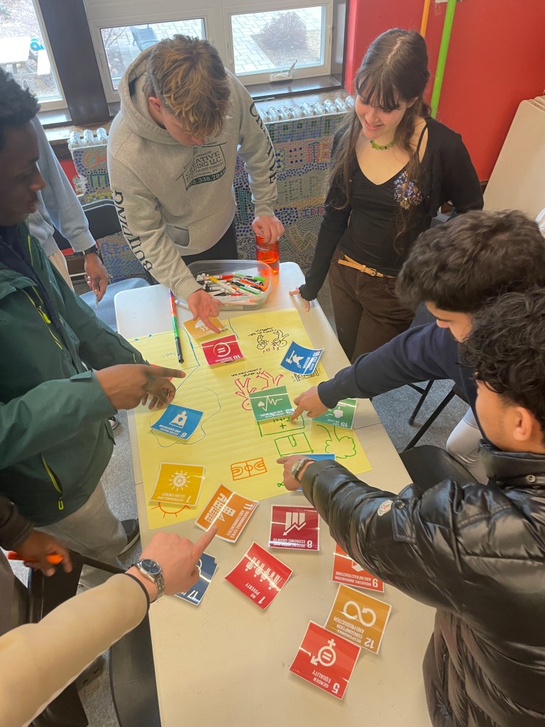 With the help of Emily Schaller, a colleague from Shelburne Farms, students overlayed the 17 U.N. SDGs over their illustrated cities.