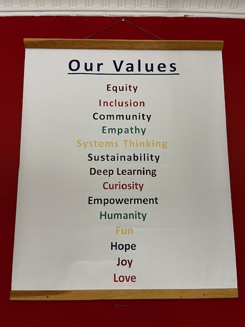 A poster with a list of Burlington City & Lake Semester’s core values hangs prominently on one of our bright red classroom walls: equity, inclusion, community, empathy, systems thinking, sustainability, deep learning, curiosity, empowerment, humanity, fun, hope, joy, and love. Each day, we practice these values through our authentic engagement with community partners and the ways we treat each other.